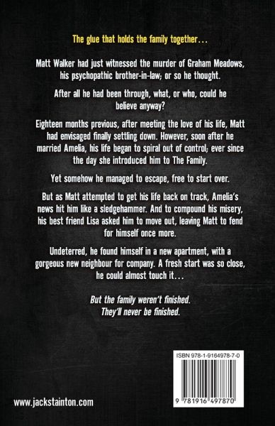 Mother: The glue that holds the family together... Matt Walker had just witnessed the murder of Graham Meadows, his psychopathic brother-in-law; or so he thought. After all he had been through, what, or who, could he believe anyway? Eighteen months previous, after meeting the love of his life, Matt had envisaged finally settling down. However, soon after he married Amelia, his life began to spiral out of control; ever since the day she introduced him to The Family. Yet somehow he managed to escape, free to start over. But as Matt attempted to get his life back on track, Amelia's news hit him like a sledgehammer. And to compound his misery, his best friend Lisa asked him to move out, leaving Matt to fend for himself once more. Undeterred, he found himself in a new apartment, with a gorgeous new neighbour for company. A fresh start was so close, he could almost touch it... But the family weren't finished. They'll never be finished. Read 'MOTHER' Now! Part Two of 'The Family' Psychological Thriller Trilogy