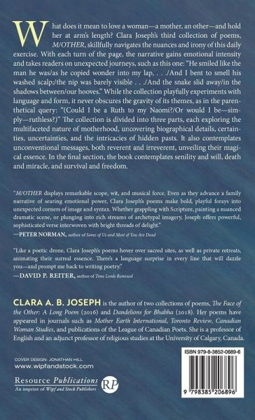 What does it mean to love a woman--a mother, an other--and hold her at arm's length? Clara Joseph's third collection of poems, M/OTHER, skillfully navigates the nuances and irony of this daily exercise. With each turn of the page, the narrative gains emotional intensity and takes readers on unexpected journeys, such as this one: ""He smiled like the man he was/as he copied wonder into my lap, . . ./And I bent to smell his washed scalp;/the nip was barely visible . . ./And the snake slid away/in the shadows between/our hooves."" While the collection playfully experiments with language and form, it never obscures the gravity of its themes, as in the parenthetical query: ""(Could I be a Ruth to my Naomi?/Or would I be--simply--ruthless?)"" The collection is divided into three parts, each exploring the multifaceted nature of motherhood, uncovering biographical details, certainties, uncertainties, and the intricacies of hidden pasts. It also contemplates unconventional messages, both reverent and irreverent, unveiling their magical essence. In the final section, the book contemplates senility and will, death and miracle, and survival and freedom.