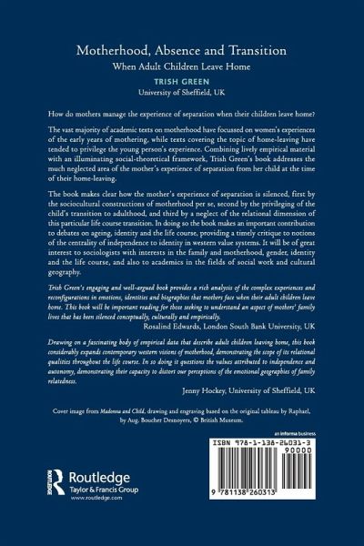 The vast majority of academic texts on motherhood have focused on women's experiences of the early years of mothering, while texts covering the topic of home-leaving have tended to privilege the young person's experience. Combining lively empirical material with an illuminating social-theoretical framework, Trish Green's book addresses the much neglected area of the mother's experience of separation from her child at the time of their home-leaving. The book makes clear how the mother's experience of separation is silenced, first by the socio-cultural constructions of motherhood per se, second by the privileging of the child's transition to adulthood, and third by a neglect of the relational dimension of this particular life-course transition. In doing so the book makes an important contribution to debates on ageing, identity and the life-course, and will be of great interest to sociologists with various academic interests.