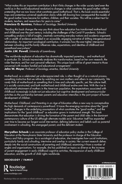 "Reading this book changes the way you think about how education has transformed motherhood and childhood over the past century, including the challenges of the Covid-19 pandemic. Schaub's compelling analysis is full of insights, creatively contrasting everyday notions and academic arguments with a wealth of evidence embedded in an accessible, engaging narrative of shifting intergenerational relationships. An important sociological contribution, it unmasks how the ever-tighter intersection between schooling and the family influences roles, expectations, and identities of childhood and parenthood everywhere."