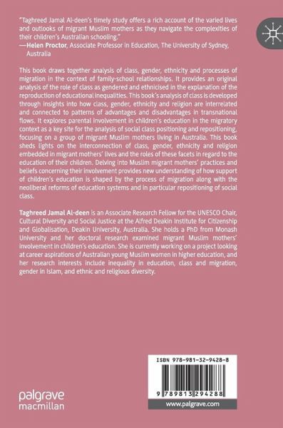 This book draws together analysis of class, gender, ethnicity and processes of migration in the context of family-school relationships. It provides an original analysis of the role of class as gendered and ethnicised in the explanation of the reproduction of educational inequalities. This book's analysis of class is developed through insights into how class, gender, ethnicity and religion are interrelated and connected to patterns of advantages and disadvantages in transnational flows. It explores parental involvement in children's education in the migratory context as a key site for the analysis of social class positioning and repositioning, focusing on a group of migrant Muslim mothers living in Australia. This book sheds lights on the interconnection of class, gender, ethnicity and religion embedded in migrant mothers' lives and the roles of these facets in regard to the education of their children. Delving into Muslim migrant mothers' practices and beliefsconcerning their involvement provides new understanding of how support of children's education is shaped by the process of migration along with the neoliberal reforms of education systems and in particular repositioning of social class.