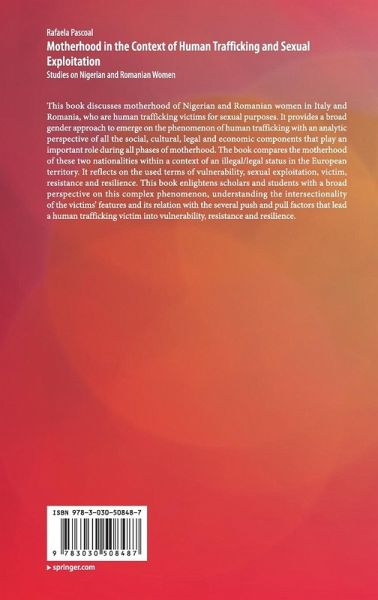 This book discusses motherhood of Nigerian and Romanian women in Italy and Romania, who are human trafficking victims for sexual purposes. It provides a broad gender approach to emerge on the phenomenon of human trafficking with an analytic perspective of all the social, cultural, legal and economic components that play an important role during all phases of motherhood. The book compares the motherhood of these two nationalities within a context of an illegal/legal status in the European territory. It reflects on the used terms of vulnerability, sexual exploitation, victim, resistance and resilience. This book enlightens scholars and students with a broad perspective on this complex phenomenon, understanding the intersectionality of the victims' features and its relation with the several push and pull factors that lead a human trafficking victim into vulnerability, resistance and resilience.