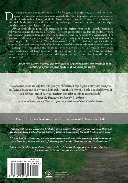 Many women question whether they want a baby or a childfree life. Motherhood – Is It For Me? is the perfect resource for addressing this crucial life choice. Find out what family planning might really mean for you with this insightful book, which offers every woman a clear path to understanding her ambivalence, moving through it, and making an informed decision about becoming a mother or remaining childfree. For partnered and single women alike, this self-help guide will lead you to your truth, gently and nonjudgmentally. A series of exercises—done at your own pace or over the book’s recommended 12 weeks—will enable you to navigate through your immobilization. You’ll learn how to let go of external circumstances that cloud the motherhood decision. No one can make the motherhood decision for you, but this self-help guide for women will help you to say hello to a new future—one of clarity and brightness. Motherhood – Is It For Me? can be read and used individually or in a women’s group. Many women feel that there’s nowhere to turn when they can’t decide whether to become mothers; they’re unsure how to think about family planning. Some think they don’t want to be a mother at all, or they might be deciding whether to become pregnant after 35 and have a baby. In all of these circumstances, women can feel lonely, isolated and debilitated. If you have these feelings, you’re not alone; so, whether you read Motherhood – Is It For Me? as an individual or in a women’s group, doing the exercises will lead you to clarity. This self-help guide includes 20 stories from women of diverse backgrounds who share their decision-making journeys; half of these women chose motherhood while half decided on a childfree life. These women’s stories create a valuable, supportive community by breaking the isolation that women often feel when they don’t know their own truths about motherhood. The authors of this book, who are both licensed Marriage and Family Therapists, created the Motherhood-Is it for me?™ program in 1991—it has had more than 25 years of proven success. Motherhood – Is It For Me? brings the methods used in that innovative, insightful program to paperback or e-book. Motherhood – Is It For Me? provides the path to a woman’s deepest desire so that she can make the motherhood decision that feels right for her. It’s a must-read if you’re undecided.