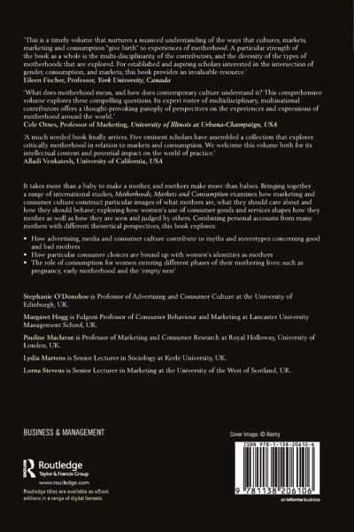 It takes more than a baby to make a mother, and mothers make more than babies. Bringing together a range of international studies, Motherhoods, Markets and Consumption examines how marketing and consumer culture constructs particular images of what mothers are, what they should care about and how they should behave; exploring how women's use of consumer goods and services shapes how they mother as well as how they are seen and judged by others. Combining personal accounts from many mothers with different theoretical perspectives, this book explores: How advertising, media and consumer culture contribute to myths and stereotypes concerning good and bad mothers How particular consumer choices are bound up with women's identities as mothers The role of consumption for women entering different phases of their mothering lives: such as pregnancy, early motherhood, and the "empty nest"