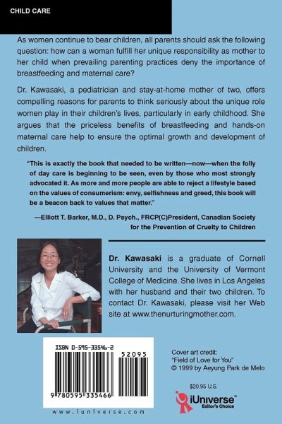 As women continue to bear children, all parents should ask the following question: How can a woman fulfill her unique responsibility as mother to her child when prevailing parenting practices deny the importance of breastfeeding and maternal care? Maternal care is now thought to be impractical and a luxury for those who can afford it. Thus, many women need to defend their right and responsibility to care for even the youngest of babies. Dr. Kawasaki, a pediatrician and stay-at-home mother of two, asserts in Mothering with Breastfeeding and Maternal Care that current attitudes toward mothering have not evolved naturally. Over the course of a century, child-rearing experts, sociologists, and feminists have made systematic efforts to undermine the importance of a woman's role in the home. Dr. Kawasaki offers compelling reasons for parents to think seriously about the unique role women play in their children's lives, particularly in early childhood. She argues that the priceless benefits of breastfeeding and hands-on maternal care help to ensure the optimal growth and development of young babies and children.