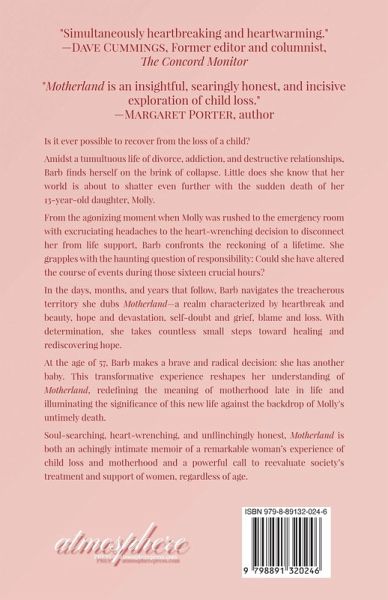 "Powerful, honest and gut-wrenching." - Paul Brogan, author "Simultaneously heartbreaking and heartwarming." - Dave Cummings, former editor and columnist, The Concord Monitor "Motherland is an insightful, searingly honest, and incisive exploration of child loss." - Margaret Porter, author --- Is it ever possible to recover from the loss of a child? Amidst a tumultuous life of divorce, addiction, and destructive relationships, Barb finds herself on the brink of collapse. Little does she know that her world is about to shatter even further with the sudden death of her 13-year-old daughter, Molly. From the agonizing moment when Molly was rushed to the emergency room with excruciating headaches to the heart-wrenching decision to disconnect her from life support, Barb confronts the reckoning of a lifetime. She grapples with the haunting question of responsibility: Could she have altered the course of events during those sixteen crucial hours? In the days, months, and years that follow, Barb navigates the treacherous territory she dubs Motherland-a realm characterized by heartbreak and beauty, hope and devastation, self-doubt and grief, blame and loss. With determination, she takes countless small steps toward healing and rediscovering hope. At the age of 57, Barb makes a brave and radical decision: she has another baby. This transformative experience reshapes her understanding of Motherland, redefining the meaning of motherhood late in life and illuminating the significance of this new life against the backdrop of Molly's untimely death. Soul-searching, heart-wrenching, and unflinchingly honest, Motherland is both an achingly intimate memoir of a remarkable woman's experience of child loss and motherhood and a powerful call to reevaluate society's treatment and support of women, regardless of age.