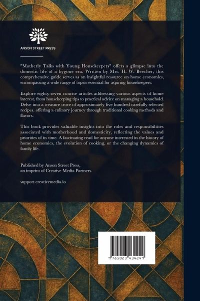 "Motherly Talks with Young Housekeepers" offers a glimpse into the domestic life of a bygone era. Written by Mrs. H. W. Beecher, this comprehensive guide serves as an insightful resource on home economics, encompassing a wide range of topics essential for aspiring housekeepers. Explore eighty-seven concise articles addressing various aspects of home interest, from housekeeping tips to practical advice on managing a household. Delve into a treasure trove of approximately five hundred carefully selected recipes, offering a culinary journey through traditional cooking methods and flavors. This book provides valuable insights into the roles and responsibilities associated with motherhood and domesticity, reflecting the values and priorities of its time. A fascinating read for anyone interested in the history of home economics, the evolution of cooking, or the changing dynamics of family life. This work has been selected by scholars as being culturally important, and is part of the knowledge base of civilization as we know it. This work is in the public domain in the United States of America, and possibly other nations. Within the United States, you may freely copy and distribute this work, as no entity (individual or corporate) has a copyright on the body of the work. Scholars believe, and we concur, that this work is important enough to be preserved, reproduced, and made generally available to the public. We appreciate your support of the preservation process, and thank you for being an important part of keeping this knowledge alive and relevant.