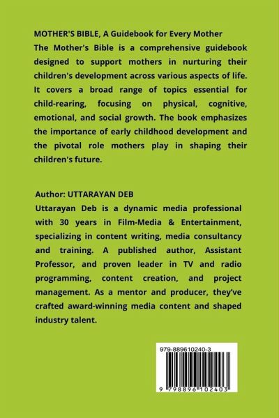 The Mother's Bible is a comprehensive guidebook designed to support mothers in nurturing their children's development across various aspects of life. It covers a broad range of topics essential for child-rearing, focusing on physical, cognitive, emotional, and social growth. The book emphasizes the importance of early childhood development and the pivotal role mothers play in shaping their children's future. Key Sections: Nutrition, Health and Wellness, Physical Development, Emotional and Social Development, Cognitive Development, Educational Development, Habits and Routines, Seasonal Protection and Safety, Behavioral Guidance, Special Needs and Inclusivity, Parental Self-Care and Cultural and Ethical Values. The book concludes by recapping these core concepts, reinforcing the holistic approach to child development that combines physical health, cognitive growth, emotional resilience, and the nurturing of ethical values and inclusivity. It serves as a resourceful guide for mothers aiming to provide well-rounded care and support for their children.