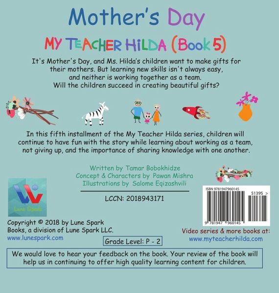 It's Mother's Day, and Ms. Hilda's children want to make gifts for their mothers. But learning new skills isn't always easy, and neither is working together as a team. Will the children succeed in creating beautiful gifts? In this fifth installment of the My Teacher Hilda series, children will continue to have fun with the story while learning about working as a team, not giving up, and the importance of sharing knowledge with one another.