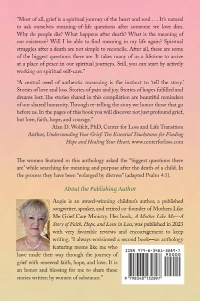 The women featured in this anthology asked the "biggest questions there are" while searching for meaning and purpose after the death of a child. In the process they have been "enlarged by distress" (adapted Psalm 4:1). "Most of all, grief is a spiritual journey of the heart and soul . . . It's natural to ask ourselves meaning-of-life questions after someone we love dies. Why do people die? What happens after death? What is the meaning of our existence? Will I be able to find meaning in my life again? Spiritual struggles after a death are not simple to reconcile. After all, these are some of the biggest questions there are. It takes many of us a lifetime to arrive at a place of peace in our spiritual journeys. Still, you can start by actively working on spiritual self-care. "A central need of authentic mourning is the instinct to 'tell the story.' Stories of love and loss. Stories of pain and joy. Stories of hopes fulfilled and dreams lost. The stories shared in this compilation are beautiful reminders of our shared humanity. Through re-telling the story we honor those that go before us. In the pages of this book you will discover not just profound grief, but love, faith, hope, and courage." -Alan D. Wolfelt, PhD, Center for Loss and Life Transition, Author, Understanding Your Grief: Ten Essential Touchstones for Finding Hope and Healing Your Heart. www.centerforloss.com