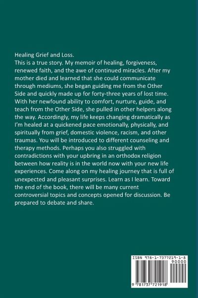 This is a true story. My memoir of healing, forgiveness, renewed faith, and the awe of continued miracles. After my mother died and learned that she could communicate through mediums, she began guiding me from the other side and quickly made up for forty-three years of lost time. With her newfound ability to comfort, nurture, guide, and teach from the Other Side, she pulled in other helpers along the way. Accordingly, my life keeps changing dramatically as I am healed at a quicken pace emotionally, physically, spiritually from grief, domestic violence, racism, and other traumas. You will be introduced to different counseling and therapy methods. Perhaps you also struggle with contradictions with your upbringing in an orthodox religion between how reality is in the world now, with your new life experiences. Come along on my healing journey that is full of unexpected and pleasant surprises. Learn as I learn. Towards the end of the book, there will be many current controversial topics and concepts open for discussion. Be prepared to debate and share.