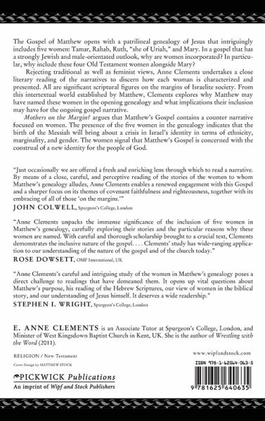 Description: The Gospel of Matthew opens with a patrilineal genealogy of Jesus that intriguingly includes five women: Tamar, Rahab, Ruth, ""she of Uriah,"" and Mary. In a gospel that has a strongly Jewish and male-orientated outlook, why are women incorporated? In particular, why include these four Old Testament women alongside Mary? Rejecting traditional as well as feminist views, Anne Clements undertakes a close literary reading of the narratives to discern how each woman is characterized and presented. All are significant scriptural figures on the margins of Israelite society. From this intertextual world established by Matthew, Clements explores why Matthew may have named these women in the opening genealogy and what implications their inclusion may have for the ongoing gospel narrative. Mothers on the Margin? argues that Matthew's Gospel contains a counter narrative focused on women. The presence of the five women in the genealogy indicates that the birth of the Messiah will bring about a crisis in Israel's identity in terms of ethnicity, marginality, and gender. The women signal that Matthew's Gospel is concerned with the construal of a new identity for the people of God.