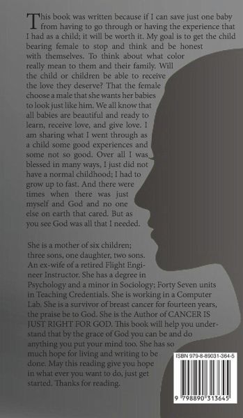 This book was written because if I can save just one baby from having to go through or having the experience that I had as a child; it will be worth it. My goal is to get the child bearing female to stop and think and be honest with themselves. To think about what color really mean to them and their family. Will the child or children be able to receive the love they deserve? That the female choose a male that she wants her babies to look just like him. We all know that all babies are beautiful and ready to learn, receive love, and give love. I am sharing what I went through as a child some good experiences and some not so good. Over all I was blessed in many ways, I just did not have a normal childhood; I had to grow up to fast. And there were times when there was just myself and God and no one else on earth that cared. But as you see God was all that I needed.