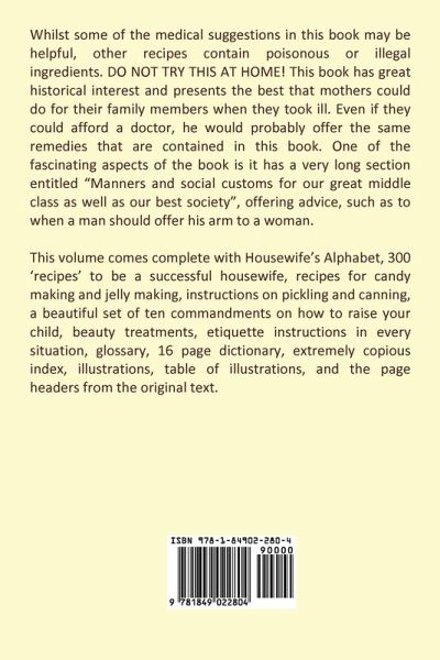 Whilst some of the medical suggestions in this book may be helpful, other recipes contain poisonous or illegal ingredients. DO NOT TRY THIS AT HOME! This book has great historical interest and presents the best that mothers could do for their family members when they took ill. Even if they could afford a doctor, he would probably offer the same remedies that are contained in this book. One of the fascinating aspects of the book is it has a very long section entitled "Manners and social customs for our great middle class as well as our best society", offering advice, such as to when a man should offer his arm to a woman. This volume comes complete with Housewife's Alphabet, 300 'recipes' to be a successful housewife, recipes for candy making and jelly making, instructions on pickling and canning, a beautiful set of ten commandments on how to raise your child, beauty treatments, etiquette instructions in every situation, glossary, 16 page dictionary, extremely copious index, illustrations, and table of illustrations.