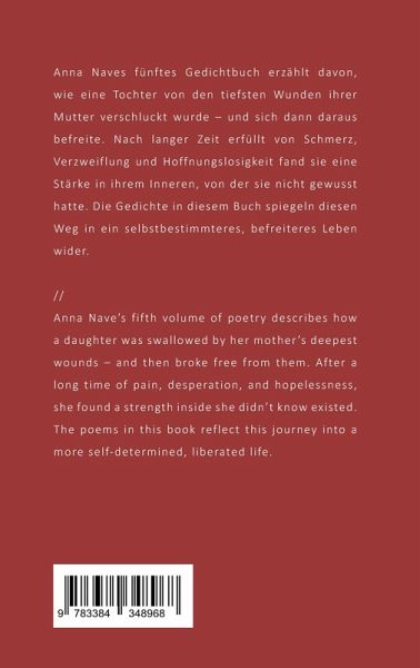 Anna Naves fünftes Gedichtbuch erzählt davon, wie eine Tochter von den tiefsten Wunden ihrer Mutter verschluckt wurde - und sich dann daraus befreite. Nach langer Zeit erfüllt von Schmerz, Verzweiflung und Hoffnungslosigkeit fand sie eine Stärke in ihrem Inneren, von der sie nicht gewusst hatte. Die Gedichte in diesem Buch spiegeln diesen Weg in ein selbstbestimmteres, befreiteres Leben wider. Die Inhalte dieses Gedichtbandes handeln von Themen wie Depression, Missbrauch, Vernachlässigung, Trauma und Selbstverletzung.//Anna Nave's fifth volume of poetry describes how a daughter was swallowed by her mother's deepest wounds - and then broke free from them. After a long time of pain, desperation, and hopelessness, she found a strength inside she didn't know existed. The poems in this book reflect this journey into a more self-determined, liberated life.The contents of this volume of poetry deal with issues like depression, abuse, neglect, trauma, and self harm.