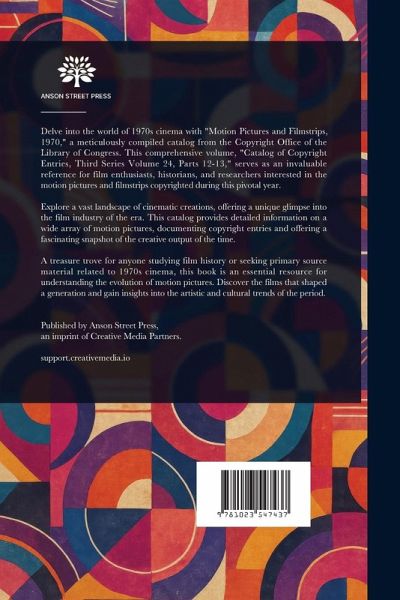 Delve into the world of 1970s cinema with "Motion Pictures and Filmstrips, 1970," a meticulously compiled catalog from the Copyright Office of the Library of Congress. This comprehensive volume, "Catalog of Copyright Entries, Third Series Volume 24, Parts 12-13," serves as an invaluable reference for film enthusiasts, historians, and researchers interested in the motion pictures and filmstrips copyrighted during this pivotal year. Explore a vast landscape of cinematic creations, offering a unique glimpse into the film industry of the era. This catalog provides detailed information on a wide array of motion pictures, documenting copyright entries and offering a fascinating snapshot of the creative output of the time. A treasure trove for anyone studying film history or seeking primary source material related to 1970s cinema, this book is an essential resource for understanding the evolution of motion pictures. Discover the films that shaped a generation and gain insights into the artistic and cultural trends of the period. This work has been selected by scholars as being culturally important, and is part of the knowledge base of civilization as we know it. This work is in the public domain in the United States of America, and possibly other nations. Within the United States, you may freely copy and distribute this work, as no entity (individual or corporate) has a copyright on the body of the work. Scholars believe, and we concur, that this work is important enough to be preserved, reproduced, and made generally available to the public. We appreciate your support of the preservation process, and thank you for being an important part of keeping this knowledge alive and relevant.
