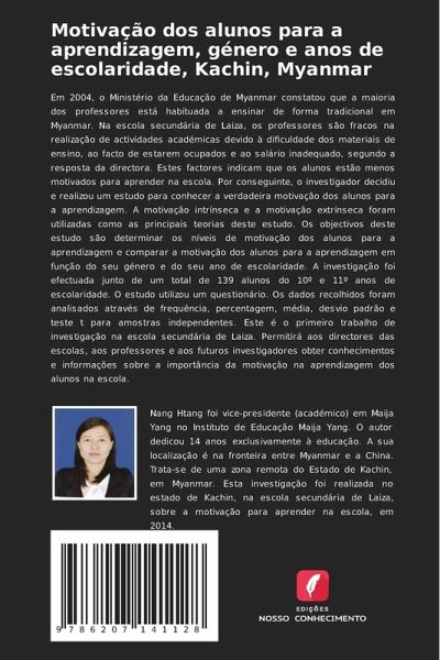 Em 2004, o Ministério da Educação de Myanmar constatou que a maioria dos professores está habituada a ensinar de forma tradicional em Myanmar. Na escola secundária de Laiza, os professores são fracos na realização de actividades académicas devido à dificuldade dos materiais de ensino, ao facto de estarem ocupados e ao salário inadequado, segundo a resposta da directora. Estes factores indicam que os alunos estão menos motivados para aprender na escola. Por conseguinte, o investigador decidiu e realizou um estudo para conhecer a verdadeira motivação dos alunos para a aprendizagem. A motivação intrínseca e a motivação extrínseca foram utilizadas como as principais teorias deste estudo. Os objectivos deste estudo são determinar os níveis de motivação dos alunos para a aprendizagem e comparar a motivação dos alunos para a aprendizagem em função do seu género e do seu ano de escolaridade. A investigação foi efectuada junto de um total de 139 alunos do 10º e 11º anos de escolaridade. O estudo utilizou um questionário. Os dados recolhidos foram analisados através de frequência, percentagem, média, desvio padrão e teste t para amostras independentes. Este é o primeiro trabalho de investigação na escola secundária de Laiza. Permitirá aos directores das escolas, aos professores e aos futuros investigadores obter conhecimentos e informações sobre a importância da motivação na aprendizagem dos alunos na escola.