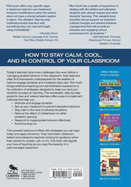 How to stay calm, cool, and in control of your classroom Today's teachers face more challenges than ever before in managing student behavior in the classroom. Rich Korb brings extensive teaching and administrative experience to his collection of strategies designed to keep teachers and students focused on learning. This accessible, step-by-step guide offers easy-to-implement methods that help you: Motivate and engage students Set up your classroom to prevent disruptive behavior Stay calm in the face of adverse situations Reduce the effect of misbehavior on other students' learning Respond to inappropriate behavior effectively Avoid burning out