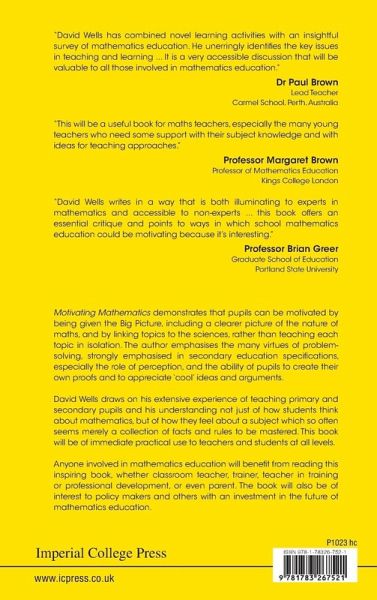 Motivating Mathematics demonstrates that pupils can be motivated by being given the Big Picture, including a clearer picture of the nature of maths, and by linking topics to the sciences, rather than teaching each topic in isolation. The author emphasises the many virtues of problem-solving, strongly emphasised in secondary education specifications, especially the role of perception, and the ability of pupils to create their own proofs and to appreciate 'cool' ideas and arguments. David Wells draws on his extensive experience of teaching primary and secondary pupils and his understanding not just of how students think about mathematics, but of how they feel about a subject which so often seems merely a collection of facts and rules to be mastered. This book will be of immediate practical use to teachers and students at all levels. Anyone involved in mathematics education will benefit from reading this inspiring book, whether classroom teacher, trainer, teacher in training or professional development, or even parent. The book will also be of interest to policy makers and others with an investment in the future of mathematics education.