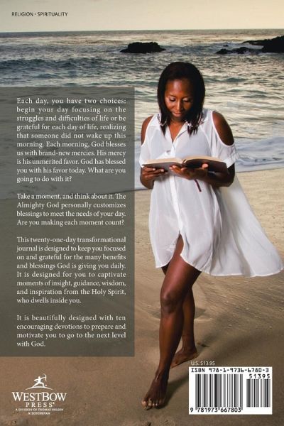 Each day, you have two choices: begin your day focusing on the struggles and difficulties of life or be grateful for each day of life, realizing that someone did not wake up this morning. Each morning, God blesses us with brand-new mercies. His mercy is his unmerited favor. God has blessed you with his favor today. What are you going to do with it? Take a moment, and think about it. The Almighty God personally customizes blessings to meet the needs of your day. Are you making each moment count? This twenty-one-day transformational journal is designed to keep you focused on and grateful for the many benefits and blessings God is giving you daily. It is designed for you to captivate moments of insight, guidance, wisdom, and inspiration from the Holy Spirit, who dwells inside you. It is beautifully designed with ten encouraging devotions to prepare and motivate you to go to the next level with God.