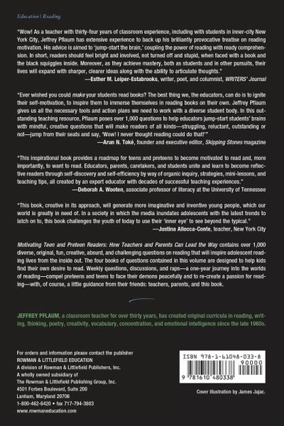 Motivating Teen and Preteen Readers: How Teachers and Parents Can Lead the Way contains over 1,000 diverse, original, fun, creative, absurd, challenging questions on reading that will inspire adolescent reading lives from the inside out. The four books of questions contained in this volume are designed to help kids help themselves find their ways to a desire to read.