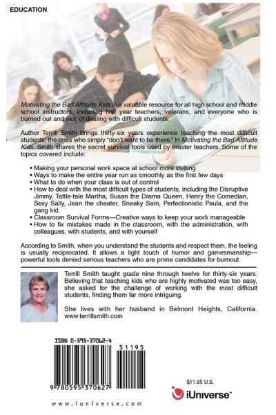 Motivating the Bad Attitude Kids is a valuable resource for all high school and middle school instructors, including first year teachers, veterans, and everyone who is burned out and sick of dealing with difficult students. Author Terrill Smith brings thirty-six years experience teaching the most difficult students; the ones who simply 'don't want to be there." In Motivating the Bad Attitude Kids, Smith shares the secret survival tools used by master teachers. Some of the topics covered include: * Making your personal work space at school more inviting * Ways to make the entire year run as smoothly as the first few days * What to do when your class is out of control * How to deal with the most difficult types of students, including the Disruptive Jimmy, Tattle-tale Martha, Susan the Drama Queen, Henry the Comedian, Sexy Sally, Jean the cheater, Sneaky Sam, Perfectionistic Paula, and the gang kid. * Classroom Survival Forms - Creative ways to keep your work manageable * How to fix mistakes made in the classroom, with the administration, with colleagues, with students, and with yourself According to Smith, when you understand the students and respect them, the feeling is usually reciprocated. It allows a light touch of humor and gamesmanship - powerful tools denied serious teachers who are prime candidates for burnout.