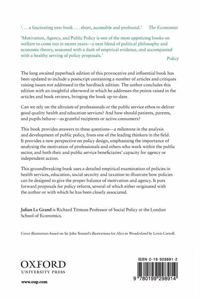 Can we rely on the altruism of professionals or the public service ethos to deliver good quality health and education services? And how should patients, parents, and pupils behave - as grateful recipients or active consumers? This book provides new answers to these questions - a milestone in the analysis and development of public policy, from one of the leading thinkers in the field. It provides a new perspective on policy design, emphasising the importance of analysing the motivation of professionals and others who work within the public sector, and both their and public service beneficiaries' capacity for agency or independent action. It argues that the conventional assumption that public sector professionals are public-spirited altruists or 'knights' is misplaced; but so is the alternative that they are all, in David Hume's terminology, 'knaves' or self-interested egoists. We also must not assume that individual citizens are passive recipients of public services (pawns); but nor can they be untrammelled sovereigns with unrestricted choices over services and resources (queens). Instead, policies must be designed so as to give the proper balance of motivation and agency. The book illustrates how this can be done by detailed empirical examination of recent policies in health services, education, social security and taxation. It puts forwards proposals for policy reform, several of which either originated with the author or with which he has been closely associated: universal capital or 'demogrants', discriminating vouchers, matching grants for pensions and for long-term care, and hypothecated taxes.