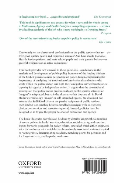 Preface 1: Introduction: Motivation, Agency, and Public Policy Part I: Theory: From Knave to Knight 2: Knights and Knaves in the Public Sector: What do we Mean and What do we Know? 3: Motivation and the Public Context 4: Knight and Knave: A Theory of Public Service Motivation Part II: From Pawn to Queen 5: Agency and Public Services 6: Agency and Public Finance Part III: Policy 7: Health Care 8: School Education 9: A Demogrant 10: Partnership Savings 11: Hypothecation Epilogue: Doux Commerce Publique