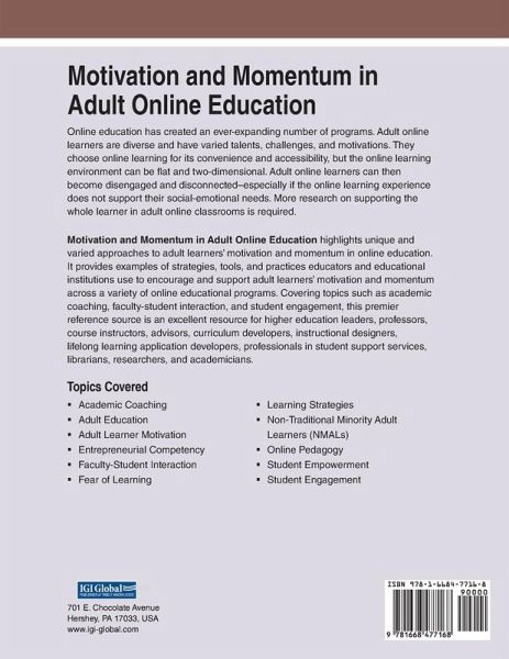 Online education has created an ever-expanding number of programs. Adult online learners are diverse and have varied talents, challenges, and motivations. They choose online learning for its convenience and accessibility, but the online learning environment can be flat and two-dimensional. Adult online learners can then become disengaged and disconnected-especially if the online learning experience does not support their social-emotional needs. More research on supporting the whole learner in adult online classrooms is required. Motivation and Momentum in Adult Online Education highlights unique and varied approaches to adult learners' motivation and momentum in online education. It provides examples of strategies, tools, and practices educators and educational institutions use to encourage and support adult learners' motivation and momentum across a variety of online educational programs. Covering topics such as academic coaching, faculty-student interaction, and student engagement, this premier reference source is an excellent resource for higher education leaders, professors, course instructors, advisors, curriculum developers, instructional designers, lifelong learning application developers, professionals in student support services, librarians, researchers, and academicians.