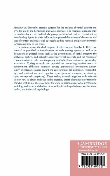 Preface; Acknowledgements; 1. Introduction: inferences from verbal material; Part I. General Issues: 2. Motivational determinants of thematic apperception; 3. How do self-attributed and implicit motives differ?; 4. Thematic analysis, experience sampling, and personal goals; 5. Motivational configurations; 6. Thematic apperceptive methods in survey research; 7. Content analysis of archival materials, personal documents, and everyday verbal productions; 8. Reliability issues; Part II. Content Analysis Systems: 9. The achievement motive; 10. A scoring manual for the achievement motive; 11. The motive to avoid success; 12. A revised scoring manual for the motive to avoid success; Part III. Afflilation: 13. The affiliation motive; 14. A scoring manual for the affiliation motive; 15. The intimacy motive; 16. The intimacy motivation scoring system; 17. Affiliative trust-mistrust; 18. A scoring system for affiliative trust-mistrust; Part IV. Power: 19. Power motivation; 20. A scoring manual for the power motive; 21. Power motivation revisited; 22. A revised scoring system for the power motive; Part V. Attribution and Cognitive Orientations: 23. Personal causation and the origin concept; 24. The origin scoring system; 25. Explanatory style; 26. The explanatory style scoring manual; 27. Conceptual/integrative complexity; 28. The conceptual/integrative complexity scoring manual; 29. Uncertainty orientation; 30. A manual for scoring need for uncertainty; Part VI. Psychosocial Orientations: 31. Assessing adaptation to life changes in terms of psychological stances toward the environment; 32. Scoring manual for psychological stances toward the environment; 33. Self-definition and social definition: personal styles reflected in narrative style; 34. Revised scoring manual for self-definition and social definition; 35. Responsibility; 36. Scoring system for responsibility; Part VII. Methodology, Scorer Training, Data Collection: 37. Methodological consideration: steps in research employing content analysis systems; Appendixes; References; Indexes.