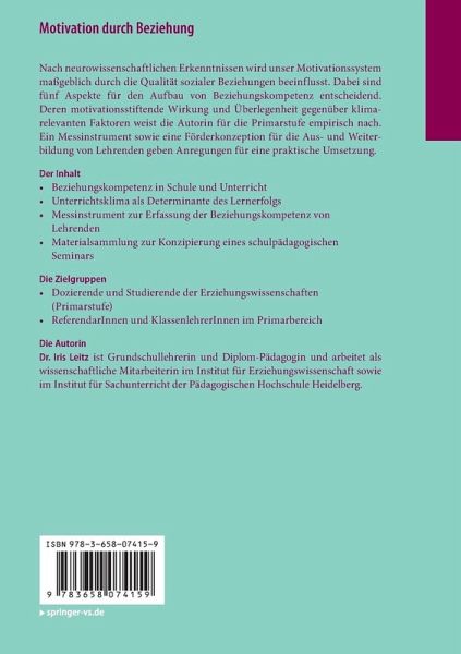 Nach neurowissenschaftlichen Erkenntnissen wird unser Motivationssystem maßgeblich durch die Qualität sozialer Beziehungen beeinflusst. Dabei sind fünf Aspekte für den Aufbau von Beziehungskompetenz entscheidend. Deren motivationsstiftende Wirkung und Überlegenheit gegenüber klimarelevanten Faktoren weist die Autorin für die Primarstufe empirisch nach. Ein Messinstrument sowie eine Förderkonzeption für die Aus- und Weiterbildung von Lehrenden geben Anregungen für eine praktische Umsetzung.