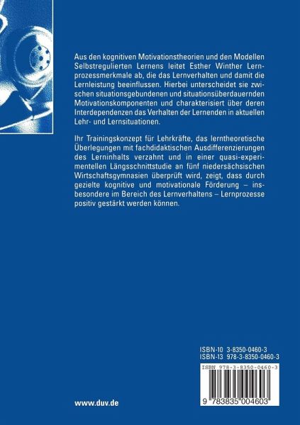Aus den kognitiven Motivationstheorien und den Modellen Selbstregulierten Lernens leitet Esther Winther Lernprozessmerkmale ab, die das Lernverhalten und damit die Lernleistung beeinflussen. Hierbei unterscheidet sie zwischen situationsgebundenen und situationsüberdauernden Motivationskomponenten und charakterisiert über deren Interdependenzen das Verhalten der Lernenden in aktuellen Lehr- und Lernsituationen.