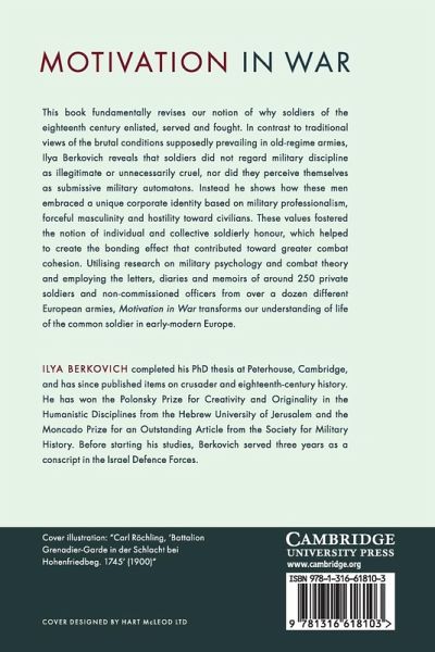This book fundamentally revises our notion of why soldiers of the eighteenth century enlisted, served and fought. In contrast to traditional views of the brutal conditions supposedly prevailing in old-regime armies, Ilya Berkovich reveals that soldiers did not regard military discipline as illegitimate or unnecessarily cruel, nor did they perceive themselves as submissive military automatons. Instead he shows how these men embraced a unique corporate identity based on military professionalism, forceful masculinity and hostility toward civilians. These values fostered the notion of individual and collective soldierly honour which helped to create the bonding effect which contributed toward greater combat cohesion. Utilising research on military psychology and combat theory, and employing the letters, diaries and memoirs of around 250 private soldiers and non-commissioned officers from over a dozen different European armies, Motivation in War transforms our understanding of life of the common soldier in early modern Europe.