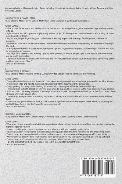 Motivation Letter - 3 Manuscripts in 1 Book, Including: How to Write a Cover Letter, How to Write a Resume and How to Change Careers. 1) HOW TO WRITE A COVER LETTER: 7 Easy Steps to Master Cover Letters, Motivation Letter Examples & Writing Job Applications. YOU'LL LEARN:What a cover letter needs and the layout expectations you can manipulate to guide the reader's eye where you want it to go. Style, nuance, and tricks you can apply to any written project, including when to evoke emotion and editing tricks no one should be without. Beyond the job posting- using your cover letters as broadly as possible, making a fillable generic, and how to prospect. How even a little bit of research can mean the difference between your cover letter landing an interview or landing in the trash. In a style guide specific to cover letters, we explore tips and suggestions unique to competitive job markets and how to spin and when to color. Red flags, deal-breakers, and warning signs to avoid yourself, as well as danger signs a prospective employer might not be worth the trouble. There is at least one exception with every hard and fast rule; learn how to turn your red flags into a celebratory banner and lean into certain "flaws". And so much more! 2) HOW TO WRITE A RESUME: 7 Easy Steps to Master Resume Writing, Curriculum Vitae Design, Resume Templates & CV Writing. YOU'LL LEARN: · The gold-standard resume and its crucial components; what you need to add and what you need to avoid at all costs. · A curriculum vitae and how to make one; how it differs from a resume and the similarities. · Cherry-picking, focusing, or diminishing your history to present yourself in the best possible light. · The hazards of outright deception; when to pad, when to skip, and how to do so in the most productive way possible. · The red flags every business is watching for; when to address the unavoidable and how to interview the interviewer back. · Create the best possible layout, from a crash course in eye-flow and what they expect to see where, to sourcing the perfect fillable form if you don't want to make one yourself. · And so much more! 3) HOW TO CHANGE CAREERS: 7 Easy Steps to Master Your Career Change, Switching Jobs, Career Coaching & New Career Planning. YOU'LL LEARN:What your current strengths and skills are so you know where to focus your efforts. How to consider your current career options and what you will need to do to get to them. How you can start to experience the world around you just by spending time volunteering and shadowing others. The importance of taking classes from time to time to get more experience and expose yourself to new subjects. Why you should take the time to choose the right career and how you can figure out which one will be just right. The importance of credentials and what you can expect when you are trying to meet them. Tips and tricks that will help you to apply to a job in a completely different field. And so much more!