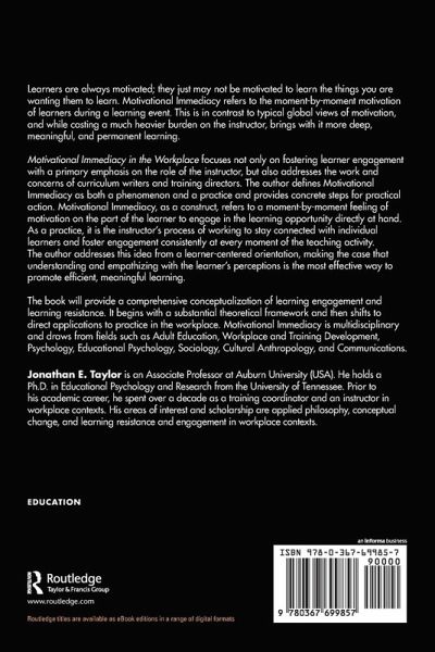 Motivational Immediacy in the Workplace focuses not only on fostering learner engagement with a primary emphasis on the role of the instructor, but also addresses the work and concerns of curriculum writers and training directors. The author defines Motivational Immediacy as both a phenomenon and a practice and provides concrete steps for practical action. Motivational Immediacy, as a construct, refers to a moment-by-moment feeling of motivation on the part of the learner to engage in the learning opportunity directly at hand. As a practice, it is the instructor's process of working to stay connected with individual learners and foster engagement consistently at every moment of the teaching activity. The author addresses this idea from a learner-centered orientation, making the case that understanding and empathizing with the learner's perceptions is the most effective way to promote efficient, meaningful learning.
