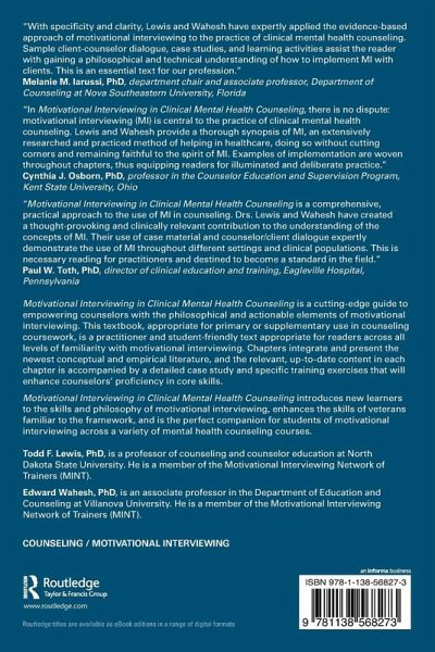 Todd F. Lewis, PhD, is a professor of counseling and counselor education at North Dakota State University. He is a member of the Motivational Interviewing Network of Trainers (MINT). Edward Wahesh, PhD, is an associate professor in the Department of Education and Counseling at Villanova University. He is a member of the Motivational Interviewing Network of Trainers (MINT).