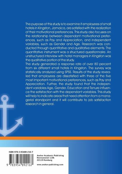 The purpose of this study is to examine if employees of small hotels in Kingston, Jamaica, are satisfied with the realization of their motivational preferences. This study also focuses on the relationship between dependant motivational preferences, such as Pay and Appreciation, and independent variables, such as Gender and Age. Research was conducted through quantitative and qualitative elements. The quantitative instrument was a structured questionnaire. An unstructured interview with hotel managers in Kingston was the qualitative portion of the study. The study generated a response rate of over 80 percent from six different small hotels in Kingston. The survey was statistically analyzed using SPSS. Results of the study revealed that employees are dissatisfied with three of the five most important motivational preferences, such as Pay and Appreciation. Further, the study found that the independent variables Age, Gender, Education and Tenure influence the satisfaction with the dependant variables. This study will help to indicate areas that need attention from a managerial standpoint and it will contribute to job satisfaction research in general.