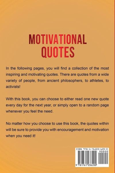 MOTIVATIONAL QUOTES Inside this book, you will find a collection of the most inspiring and motivating quotes. There are quotes from a wide variety of people, from ancient philosophers, to athletes, to activists! With this book, you can choose to either read one new quote every day for the next year, or simply open to a random page whenever you feel the need. No matter how you choose to use this book, the quotes within will be sure to provide you with encouragement and motivation when you need it!