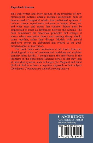 This well-written and lively account of the principles of how motivational systems operate includes discussions of both theories and empirical results from individual systems. It reviews current experimental evidence on hunger, thirst, sex and other areas and argues that common factors must be emphasised as much as differences between the systems. The book summarises the theoretical principles that emerge: it shows where motivation theory and learning theory should come together, rather than diverge. Models with general predictive power are elaborated and related to the goal directed aspect of motivation. The book deals with motivation at all levels from the physiological to that of mathematical modelling and explains complex ideas lucidly. It complements other books in the Problems in the Behavioural Sciences Series including Hunger (le Magnen), Thirst (Rolls & Rolls) and Contemporary Animal Learning Theory (Dickson).