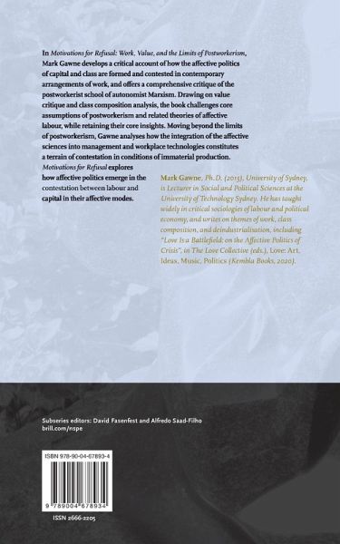 In Motivations for Refusal: Work, Value, and the Limits of Postworkerism, Mark Gawne develops a critical account of how the affective politics of capital and class are formed and contested in contemporary arrangements of work, and offers a comprehensive critique of the postworkerist school of autonomist Marxism. Drawing on value critique and class composition analysis, the book challenges core assumptions of postworkerism and related theories of affective labour, while retaining their core insights. Moving beyond the limits of postworkerism, Gawne analyses how the integration of the affective sciences into management and workplace technologies constitutes a terrain of contestation in conditions of immaterial production. Motivations for Refusal explores how affective politics emerge in the contestation between labour and capital in their affective modes.