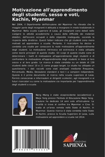 Nel 2004, il Dipartimento dell'Istruzione del Myanmar ha rilevato che la maggior parte degli insegnanti è abituata a insegnare in modo tradizionale in Myanmar. Nella scuola superiore di Laiza, gli insegnanti sono deboli nello svolgere le attività accademiche a causa della difficoltà dei materiali didattici, dell'essere occupati e dello stipendio inadeguato, secondo la risposta della direttrice. Questi fattori indicano che gli studenti sono meno motivati ad apprendere a scuola. Pertanto, il ricercatore ha deciso e condotto uno studio per conoscere la reale motivazione all'apprendimento degli studenti. La motivazione intrinseca ed estrinseca è stata utilizzata come teorie principali di questo studio. Gli scopi di questo studio sono di determinare i livelli di motivazione all'apprendimento degli studenti e di confrontare la motivazione all'apprendimento degli studenti in base al loro sesso e al loro grado. La ricerca è stata condotta su un totale di 139 studenti delle classi 10 e 11 come gruppo target. Lo studio ha utilizzato un questionario. I dati raccolti sono stati analizzati mediante Frequenza, Percentuale, Media, Deviazione standard e test t a campioni indipendenti. Questo è il primo documento di ricerca nella scuola superiore di Laiza. Fornirà conoscenze e informazioni ai dirigenti scolastici, agli insegnanti e ai futuri ricercatori su come la motivazione sia importante per l'apprendimento degli studenti a scuola.