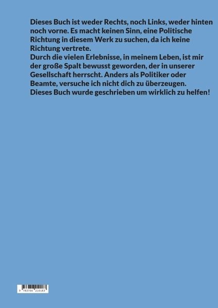 Dieses Buch ist weder Rechts, noch Links, weder hinten noch vorne. Es macht keinen Sinn, eine Politische Richtung in diesem Werk zu suchen, da ich keine Richtung vertrete. Durch die vielen Erlebnisse, in meinem Leben, ist mir der große Spalt bewusst geworden, der in unserer Gesellschaft herrscht. Anders als Politiker oder Beamte, versuche ich nicht dich zu überzeugen. Dieses Buch wurde geschrieben um wirklich zu helfen!