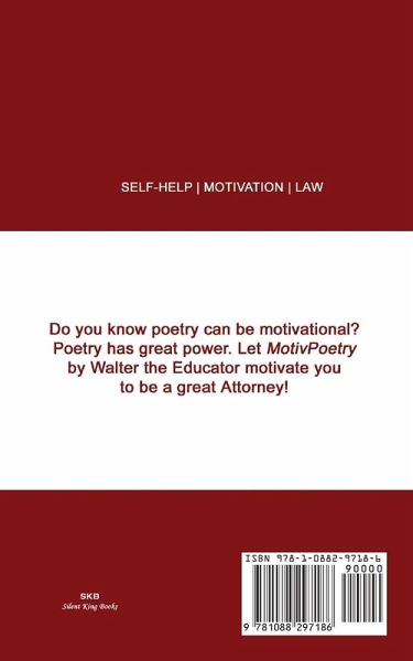 Do you know poetry can be motivational? Poetry has great power. Let MotivPoetry by Walter the Educator motivate you to be a great Attorney; it is the perfect gift for yourself or the favorite Lawyer in your life. Creating a poetry book about being a great attorney can serve multiple purposes. Firstly, it is a unique and creative way to explore the experiences, challenges, and triumphs of being in the legal profession. Poetry allows for a more emotional and introspective approach, capturing the essence of what it means to be a lawyer. Secondly, this book can inspire and educate aspiring attorneys. By sharing anecdotes, insights, and reflections through poetry, it can offer a different perspective on the legal profession. It can shed light on the dedication, intellect, and compassion required to excel in this field. Lastly, this poetry book about being a great attorney can serve as a form of self-expression and a means of connecting with those in the legal community. Poetry has the power to evoke emotions, create empathy, and foster a sense of community.