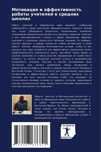 Rabota uchitelej w sowremennom mire wyzywaet global'nuü ozabochennost' sredi uchastnikow obrazowatel'nogo processa. Vsqkij raz, kogda publikuütsq rezul'taty nacional'nyh äkzamenow, otrazhaüschie prezritel'nye rezul'taty uchenikow, roditeli, politiki i wse zainteresowannye storony w sfere obrazowaniq obwinqüt uchitelej w plachewnyh rezul'tatah obucheniq uchenikow. I naoborot, uchitelq priwodqt w primer mnozhestwo slabyh motiwatorow w swoej rabote. Uchitelü neobhodimy blagopriqtnye uslowiq, chtoby on mog raskryt' wse swoi sposobnosti dlq äffektiwnogo wypolneniq swoego professional'nogo uchitel'skogo dolga; dostojnoe zhil'e rqdom so shkoloj, priznanie so storony wlastej, prodwizhenie po sluzhbe mogut powliqt' na chastoe poseschenie uchitelem shkoly i akademicheskuü uspewaemost' uchenikow. Poätomu w dannom issledowanii byla postawlena cel' izuchit' wzaimoswqz' mezhdu motiwaciej i äffektiwnost'ü raboty uchitelej w srednih shkolah okruga Bukedea w Vostochnoj Ugande. Statistika t-testa dlq nemonetarnyh, monetarnyh motiwatorow i äffektiwnosti raboty uchitelej pokazala, chto p-znachenie dlq wseh punktow sostawilo 0,000, chto ukazywaet na statisticheski znachimoe otlichie ot srednego soglasiq, wyqwlqüschee sil'nuü polozhitel'nuü swqz' mezhdu gipoteticheskimi peremennymi i konstruktami dannogo issledowaniq.