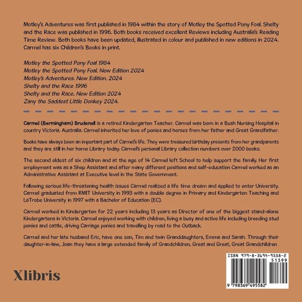 Motley's Adventures was first published in 1984 within the story of Motley the Spotted Pony Foal. Shelty and the Race was published in 1996. Both books received excellent Reviews including Australia's Reading Time Review. Both books have been updated, illustrated in colour and published in new editions in 2024. Carmel has six Children's Books in print. Motley the Spotted Pony Foal 1984 Motley the Spotted Pony Foal. New Edition 2024 Motley's Adventures. New Edition. 2024 Shelty and the Race 1996 Shelty and the Race. New Edition 2024 Zany the Saddest Little Donkey 2024.