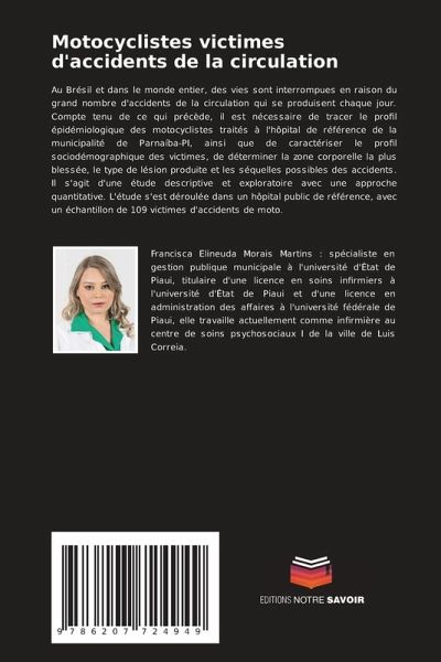 Au Brésil et dans le monde entier, des vies sont interrompues en raison du grand nombre d'accidents de la circulation qui se produisent chaque jour. Compte tenu de ce qui précède, il est nécessaire de tracer le profil épidémiologique des motocyclistes traités à l'hôpital de référence de la municipalité de Parnaíba-PI, ainsi que de caractériser le profil sociodémographique des victimes, de déterminer la zone corporelle la plus blessée, le type de lésion produite et les séquelles possibles des accidents. Il s'agit d'une étude descriptive et exploratoire avec une approche quantitative. L'étude s'est déroulée dans un hôpital public de référence, avec un échantillon de 109 victimes d'accidents de moto.