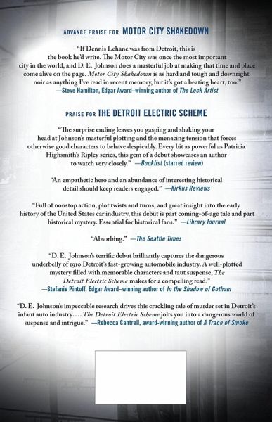 D.E. JOHNSON, a graduate of Central Michigan University, is a history buff who has been writing fiction since childhood. The early 20th century, a time of big ambitions, huge achievements, and crushing poverty, holds a special fascination for him. Johnson comes by his interest in automotive history honestly. His grandfather was the Vice President of Checker Motors, beginning work with Checker in 1924 and continuing until the 1970's. Fortunately, he doesn't come by his interest in murder the same way. He is the author of books including The Detroit Electric Scheme and Motor City Shakedown. The author is married, has three daughters, and lives near Kalamazoo, Michigan.