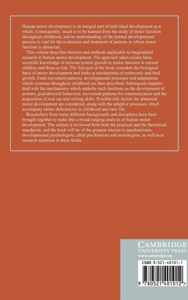 Motor development is an integral part of the developmental process. Understanding the organization of the sensory-motor system and its adaptations in response to environmental factors is a vital part of understanding individual development as a whole. This volume describes and discusses human motor development using longitudinal study methods, and from an interdisciplinary perspective. Researchers from a variety of different backgrounds and disciplines provide a broad-ranging analysis of human motor development, from both the practical and theoretical standpoint, in a book which will be of great interest to paediatricians, psychologists, developmental biologists, developmental psychiatrists and neurologists as well as to research scientists in these fields.