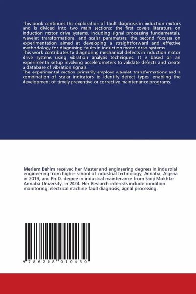 This book continues the exploration of fault diagnosis in induction motors and is divided into two main sections: the first covers literature on induction motor drive systems, including signal processing fundamentals, wavelet transformations, and scalar parameters; the second focuses on experimentation aimed at developing a straightforward and effective methodology for diagnosing faults in induction motor drive systems.This work contributes to diagnosing mechanical defects in induction motor drive systems using vibration analysis techniques. It is based on an experimental setup involving accelerometers to validate defects and create a database of vibration signals.The experimental section primarily employs wavelet transformations and a combination of scalar indicators to identify defect types, enabling the development of timely preventive or corrective maintenance programs.