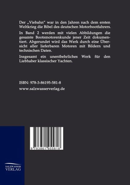 Der "Viebahn" war in den Jahren nach dem ersten Weltkrieg die Bibel des deutschen Motorbootfahrers. In Band 2 werden mit vielen Abbildungen die gesamte Bootsmotorenkunde jener Zeit dokumentiert. Abgerundet wird das Werk durch eine Übersicht aller lieferbaren Motoren mit Bildern und technischen Daten. Insgesamt ein unentbehrliches Werk für den Liebhaber klassischer Yachten.